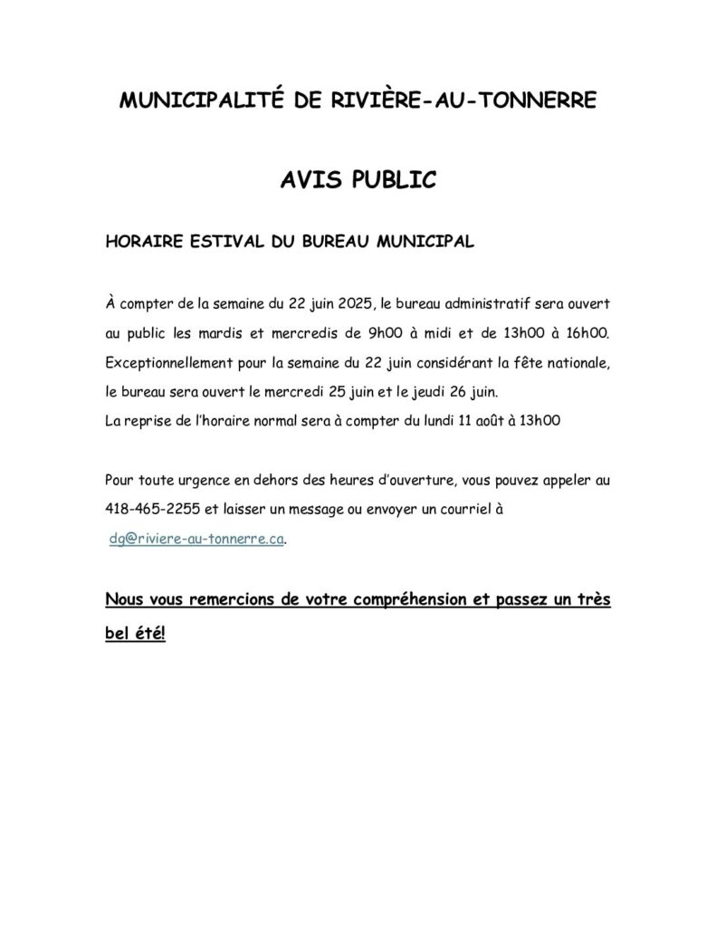 Avis public – Horaire estival du bureau municipal